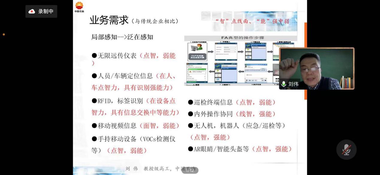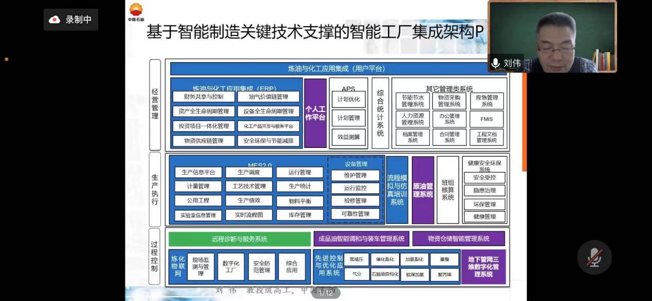 2022年10月26日下午,1946伟德国际源自英国企业家讲坛在线上举行,本期论坛由1946伟德国际源自英国主办。中国石油炼化板块智能化总体专家组顾问,大庆石化信息技术原中心主任、副总工程师、1946伟德国际源自英国(自动化、计算机应用专业)兼职教授、研究生导师,教授级高级工程师刘伟应邀担当本期讲坛主讲专家,刘伟教授以“智能制造关键技术”为题,对石油石化企业在新一代信息技术应用于设计、生产、管理、服务等制造活动各个环节,如何缩短产品研制周期、降低资源能源消耗、降低运营成本、提高生产效率、提升产品质量等问题进行了阐述。计算机科学与信息技术学全体教师、相关公司部分教师和公司2019级、2020级部分员工聆听了讲座。