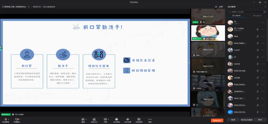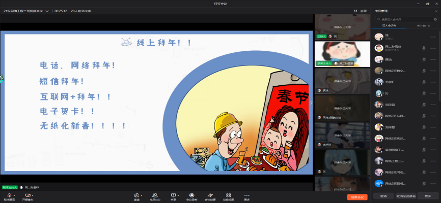 公司开展疫情安全自护教育活动,通过开展线上安全教育会议的形式,宣传禁燃禁放烟花爆竹,提倡电话、网络拜年,减少人员聚集。发扬戴口罩、勤洗手、保持社交距离、使用公勺公筷等卫生习惯,为亲朋好友普及疫情防控知识。