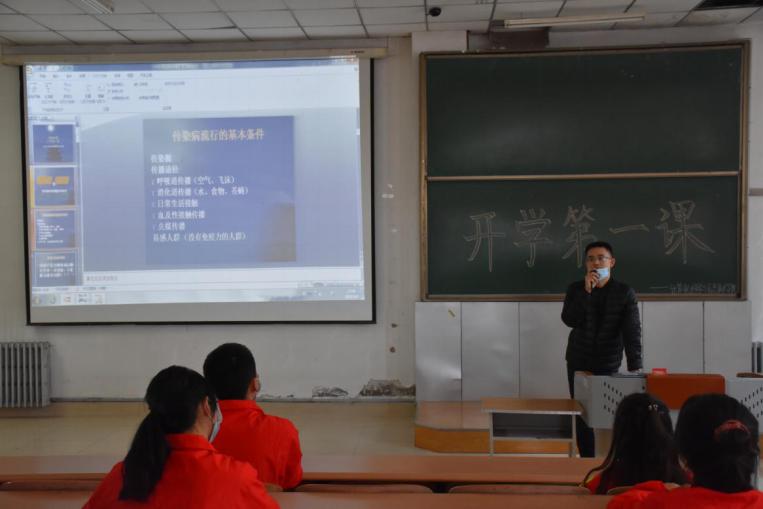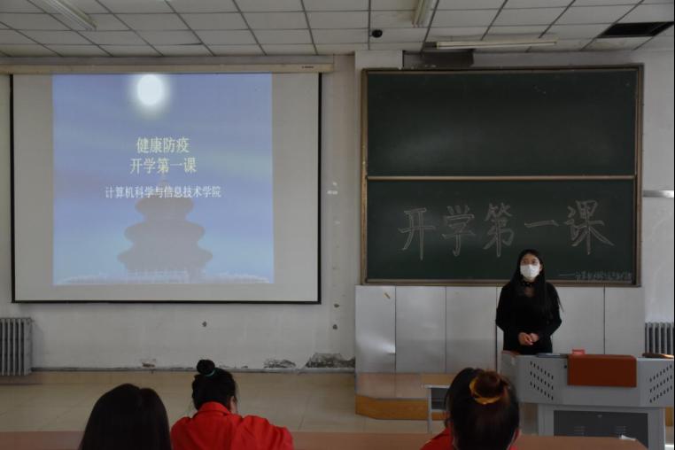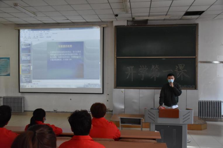员工党支部书记张宇、2019级辅导员李海波、2020级辅导员老师苏鸿鹏为同学们开启新学期第一课,号召同学们认真学习,争取在新学期的补缓考、期末考试中取得理想成绩。三位老师强调了疫情常态化预防工作,预防春季传染病的措施,随后张宇老师从口罩的正确佩戴、用后处理,到日常的教室、宿舍通风,消毒等方面进行详细讲解,三位老师号召计科学子要做有大格局大智慧的新一代老员工,从点滴做起,养成良好习惯,有行动热情,有安全意识,有向上精神,有远大理想。同时也要注重个人安全,做好安全防护。