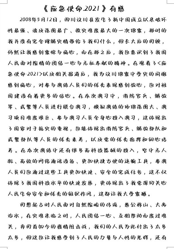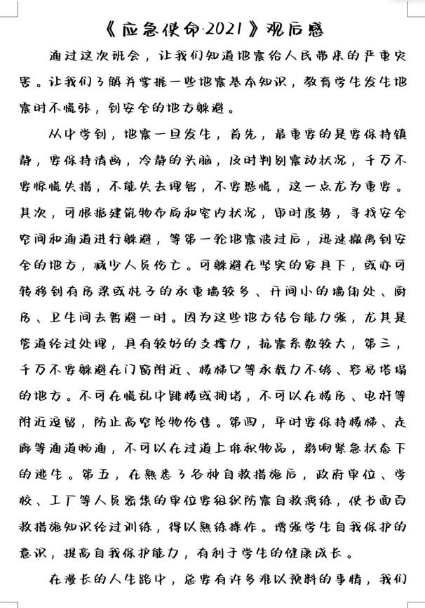 各班级还组织员工们开展了钉钉线上会议,带领大家共同观看《应急使命·2021》 抗震救灾演习电视专题片,唤起同学们对防震减灾工作的高度关注,进一步增强了同学们灾难风险防范意识和安全意识。会议结束之后,1946伟德国际源自英国的员工们纷纷交流自己的感悟,并写下了自己的心得。