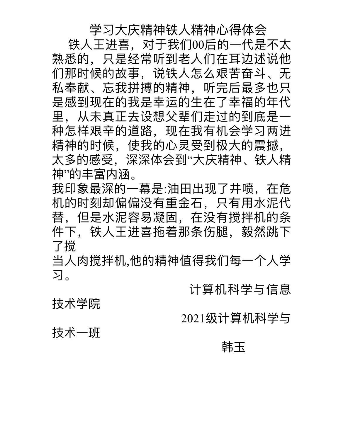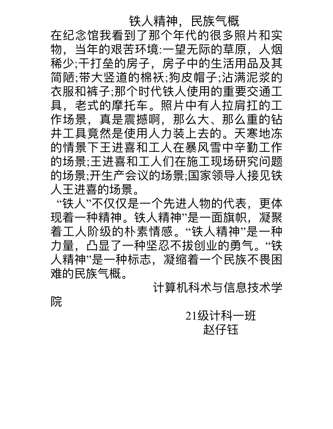 云直播结束后,同学们纷纷撰写了参观铁人纪念馆的心得体会。铁人精神已经成为中华民族伟大精神的重要组成部分,永远是激励中国人民不畏艰难、勇往直前的宝贵精神财富。大家表示,一定会结合自身实际学习铁人不畏艰险、勇于担当、艰苦朴素、关爱他人的精神和品质,把“不忘初心,牢记使命”主题教育不断引向深入,精益求精,再创佳绩。