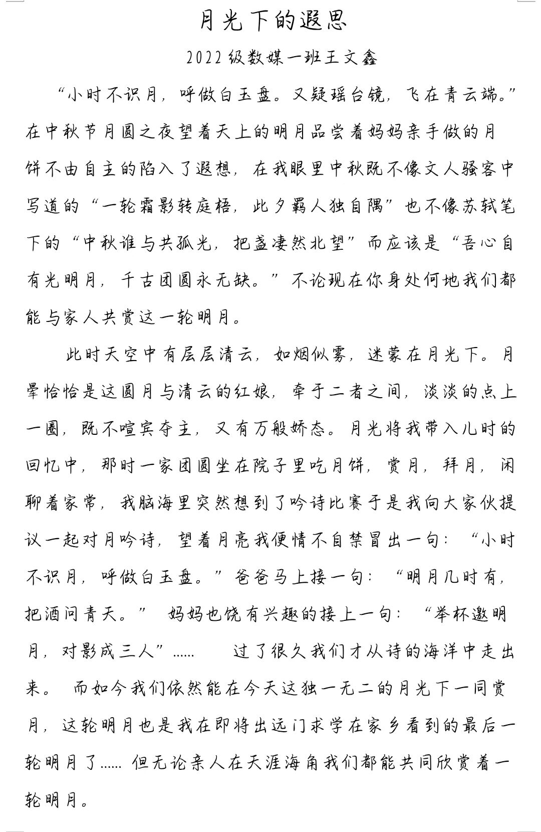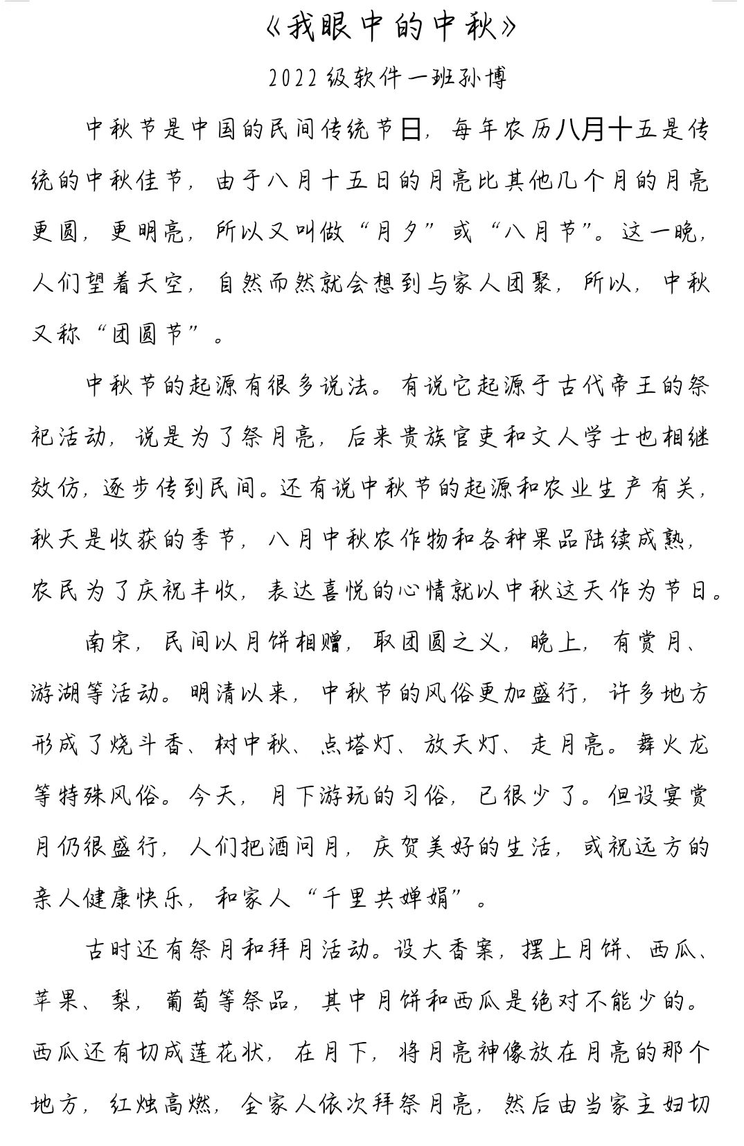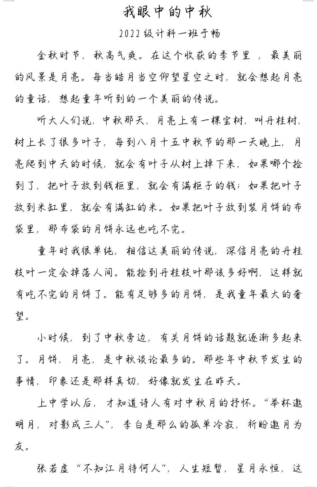 今年的中秋,计科学子们用自己细腻的笔触,作文话中秋。面对着圆圆的月亮,品着圆圆的月饼,和家人欢聚一堂,这一刻天上的明月寄托着大家对美满生活所有的期盼。