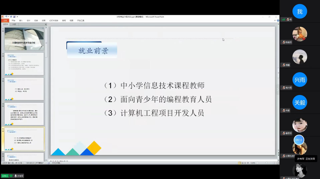 本专业由公司许有军老师作为主讲人对新生进行专业介绍。许老师强调计算机科学与技术是研究整个计算机的生态系统,包括硬件、软件、网络,总言之是一个大而全的专业,所以学习偏理论,系统性强。它也是一个比较传统的计算机专业,开设计算机公司的高校一般都有这个专业。除此之外,许老师介绍了本专业的课程体系、培养目标以及就业前景。