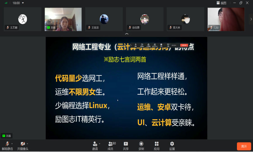 本专业由公司刘春老师做具体讲解。刘春老师讲到,网络工程是主要研究计算机网络的专业,一般来说,除了计算机公共基础课外,会比较深入地研究计算机网络的硬软件管理、应用、开发等。它是一个集网络策划、建设、维护为一体的专业,是一个偏硬件的工科专业,主要学习网络规划、综合布线、防火墙、路由器、交换机的配置,等等。刘老师还介绍了行业背景、特点以及公司网络工程专业的教学团队。