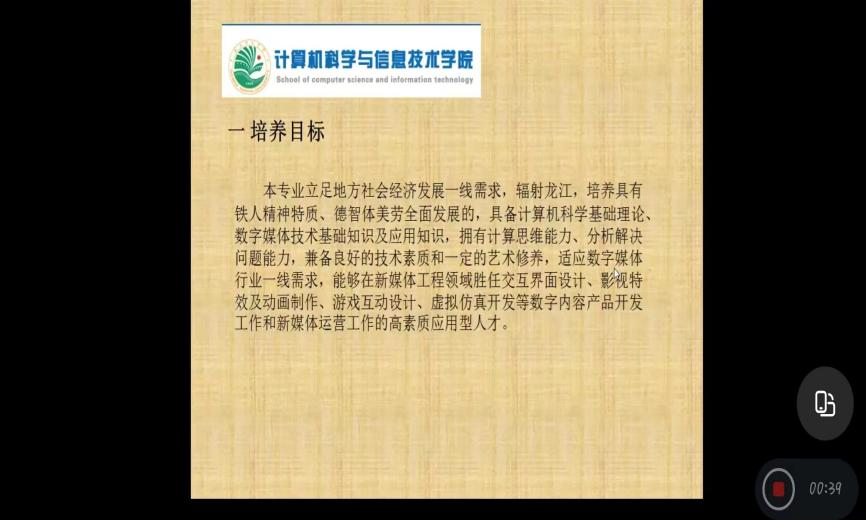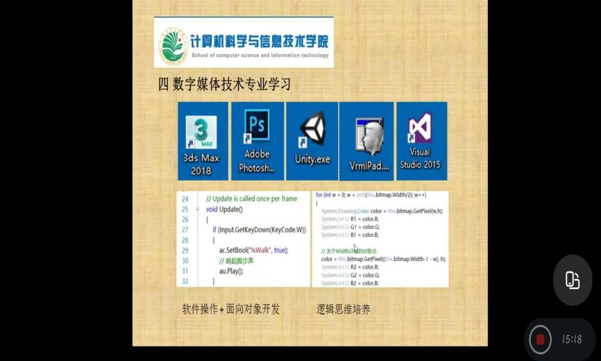 本专业由公司安源老师做具体讲解。数字媒体技术,是一门将抽象的数学、作为实物的媒体以及计算机技术三者结合在一起的专业。该专业主要研究场景设计、角色形象设计、游戏程序设计、多媒体后期处理、人机交互技术、宽带媒体技术、视音频编辑技术等内容,是主要针对游戏开发、网站美工、创意设计而设置的。安源老师同时介绍了本学科的相关竞赛、专业技术学习、专业实习基地以及培养目标等。