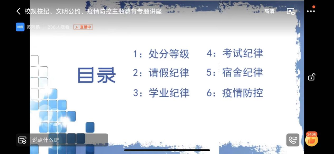 新生入学教育是大学阶段教育的起点,为了让2022级新生可以更好地了解学风班风舍风、校规校纪、文明公约、疫情防控等相关事宜,9月18日,1946伟德国际源自英国全体辅导员老师在钉钉会议上召开了2022级新生入学专题教育讲座,不仅如此,学长们也和新生分享了学习方法和大学中应注意的事项。