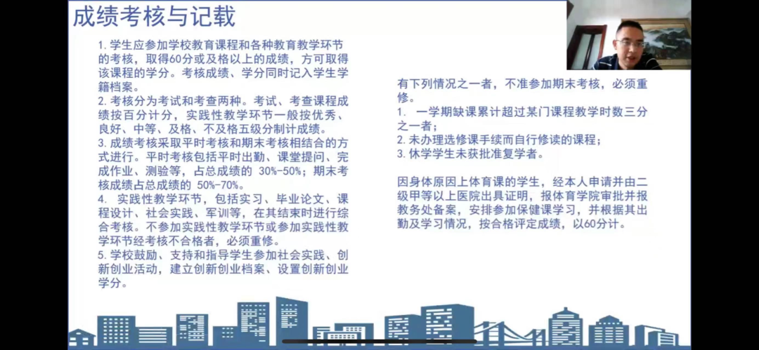 苏鸿鹏老师为新生详细地讲述了校规校纪,如处分等级的种类、违纪处理办法和时限、考勤管理中的学业纪律、学习年限、成绩考核与记载、学位授予、考试纪律、违纪认定与处理以及宿舍管理等方面,并强调了疫情防控下公司的相关规定,苏老师通过一系列的案例,警醒同学们一定要遵守校规校纪。