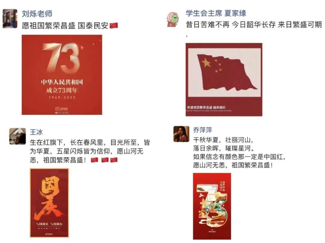 每年国庆,公司的老师、学子们都会以不同的方式为祖国母亲庆生,今年公司朋友圈里也依旧被满满的祝福刷屏,小编翻了翻朋友圈截了几张图,一起来看看他们为祖国母亲庆生都说了些什么吧!