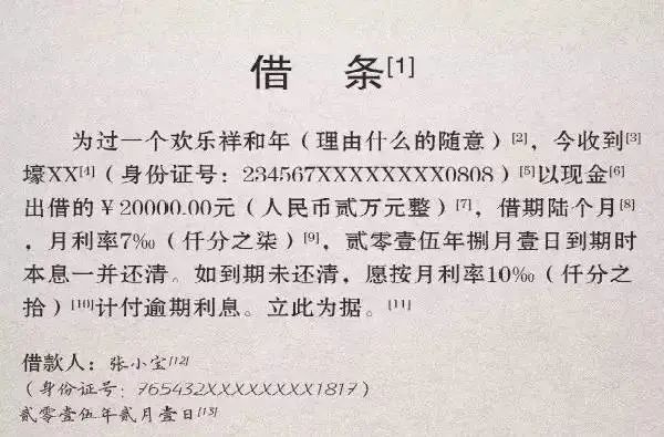 一定要写明收钱人的姓名和身份证号码(为了防止对方抵赖说这张借条是你和另一个和他同名同姓的人写的)。币种要写清楚,数额金额大写(防止篡改)。