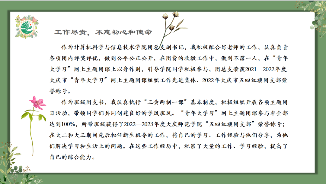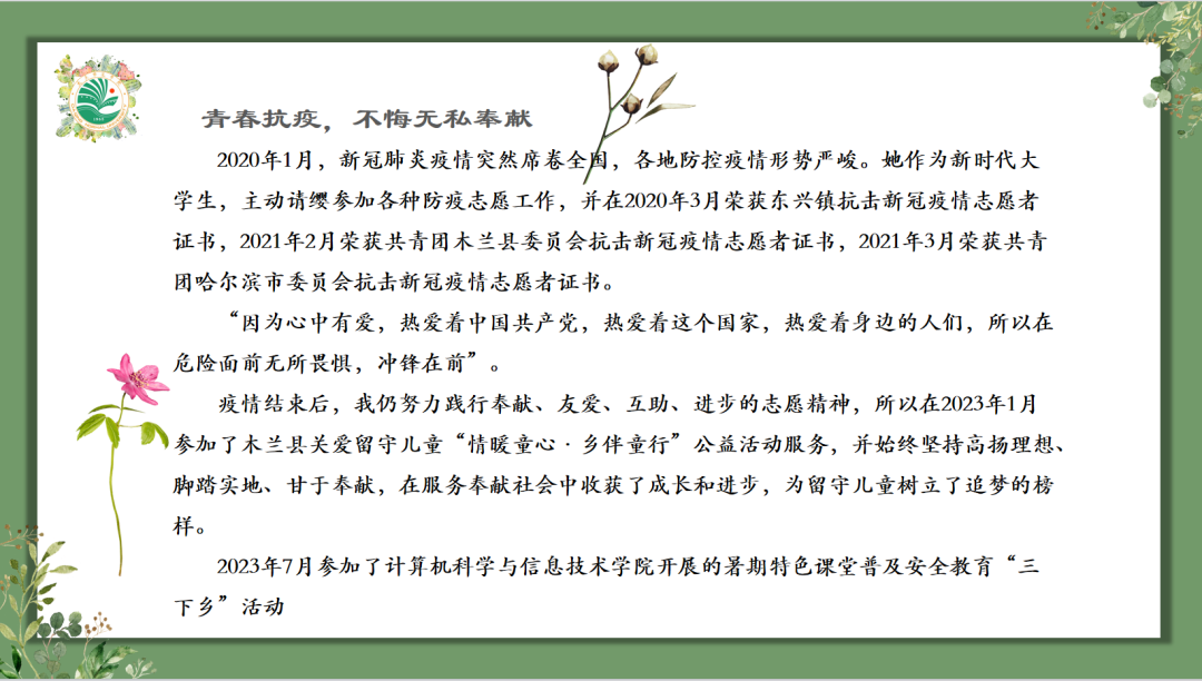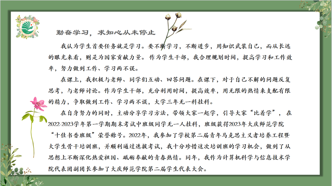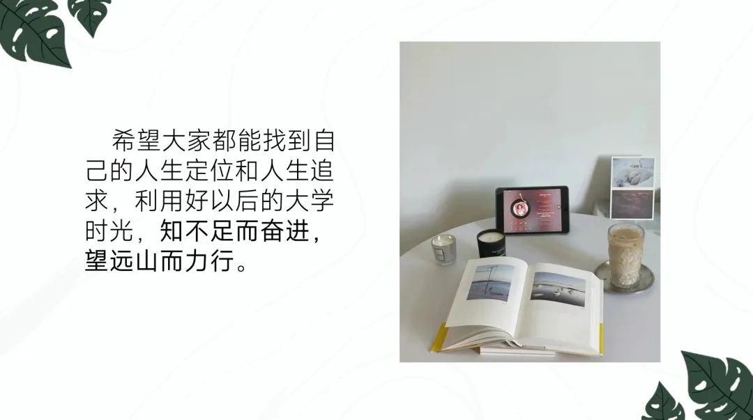 希望学弟学妹们都能找到自己的人生定位和人生追求,利用好以后的大学时光,知不足而奋进,望远山而力行。
