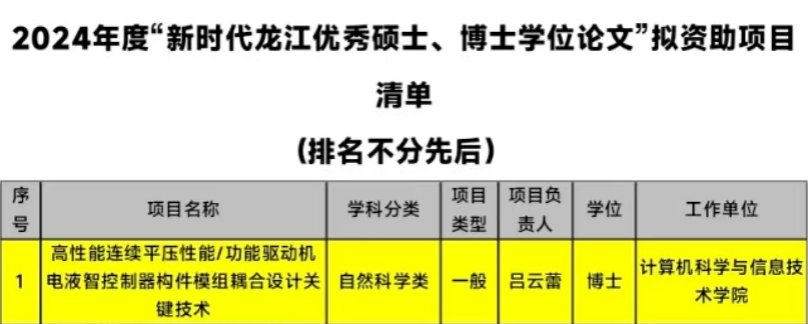近日,黑龙江省教育厅正式公示了2024年度“新时代龙江优秀硕士、博士学位论文”拟资助项目名单。经严格评审,公司教师吕云蕾的博士论文《高性能连续平压性能/功能驱动机电液智控制器构件模组耦合设计关键技术》脱颖而出获得资助。