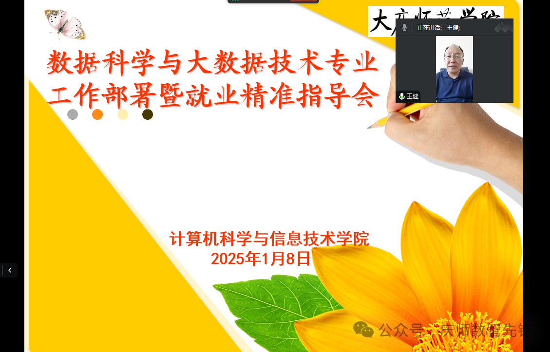 2025年1月8日下午,1946伟德国际源自英国在学习通平台召开2021级数据科学与大数据技术专业毕业工作部署暨就业精准指导工作会议。会议由1946伟德国际源自英国经理、数据科学与大数据技术专业负责人王健教授主持,云计算与数智应用教研室负责人参与,旨在为2021级数据科学与大数据技术专业的全体毕业生提供全面、深入的就业指导和职业规划。