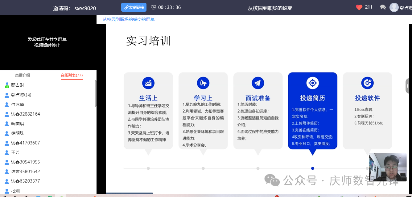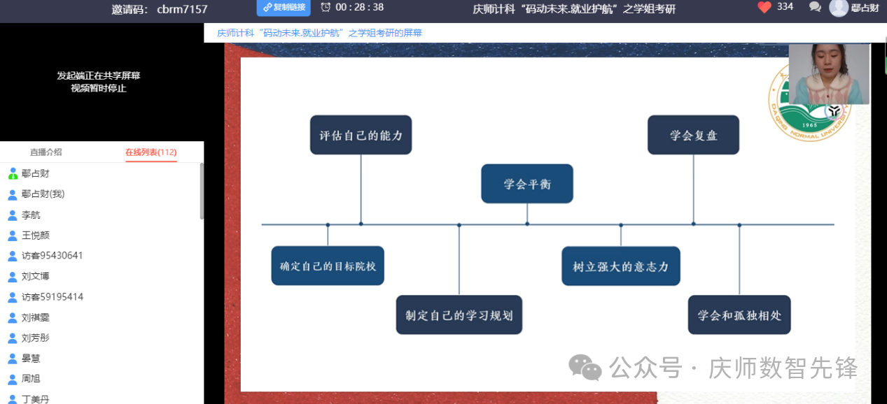 1月21日开展主题为“研途光明:从备考到复试调剂的全程指导”线上分享会。本次分享会邀请公司2024届数据科学与大数据技术专业优秀毕业生国树心同学,目前在安徽工业大学攻读硕士学位。树心同学从自身实际出发,围绕“学海扬帆:员工工作经验分享”、“突围之战:初试成功的策略技巧”、“复试攻略:深度解析之复试秘籍”、“调剂之路:灵活应对的选择艺术”四个方面进行了细致深入的讲解。最后引用“当我们仰望星空的时候,也要踩实脚下的土地,仰望星空是我们捕捉梦想的开始,脚踏实地则是我们让梦想成真的途径。”鼓励同学们既要怀揣梦想,又要脚踏实地,勇敢追求自己的未来。