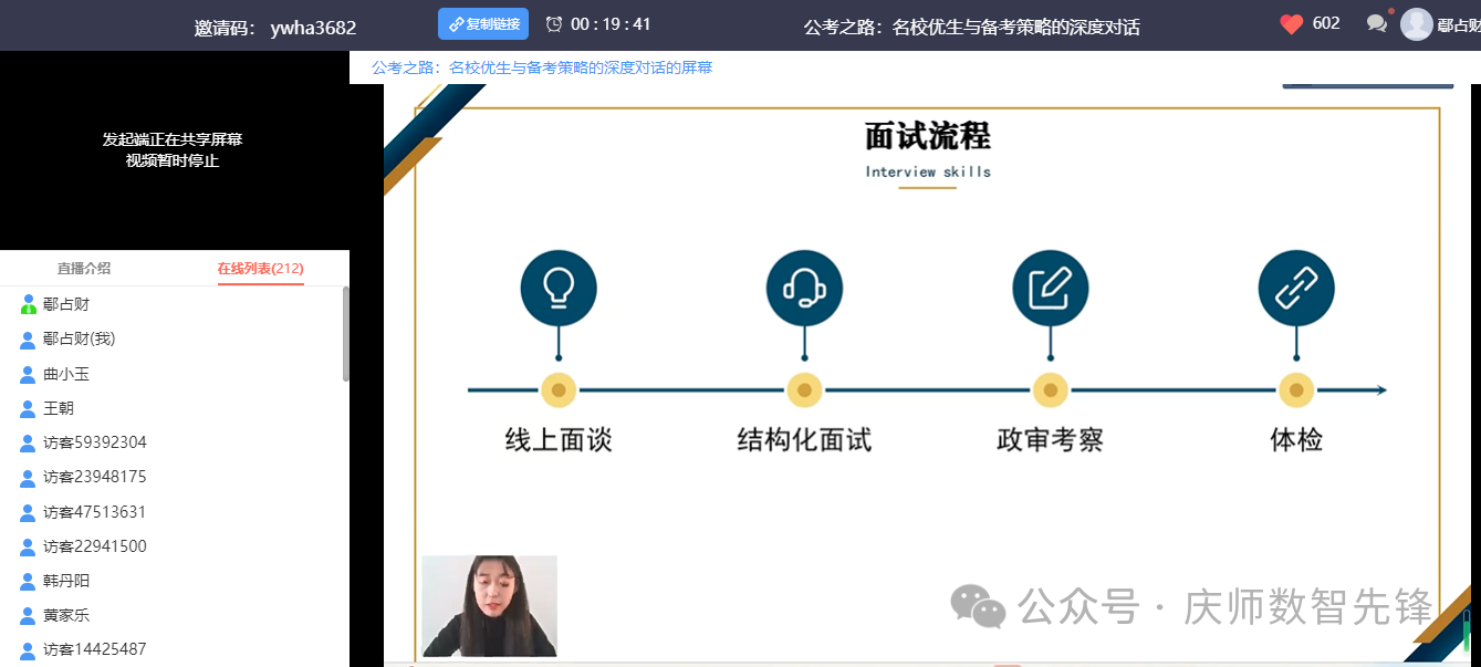 1月19日开展主题“公考之路:名校优生与备考策略的深度对话”线上分享会 ,本次分享会旨在帮助同学们更好地了解公务员考试,掌握备考策略,明确未来规划。主讲人为公司2024届数据科学与大数据技术专业优秀毕业生赵超越,现任职于齐齐哈尔市依安县国家保密局。超越同学结合自身经验和实际情况从备考目标、考试类型、目标职位、学习计划、面试技巧等方面进行了分享。最后,她鼓励同学们要注重平时知识的积累和能力的提升,利用碎片时间学习热点时事、国家政策等,为考试做好充分准备。