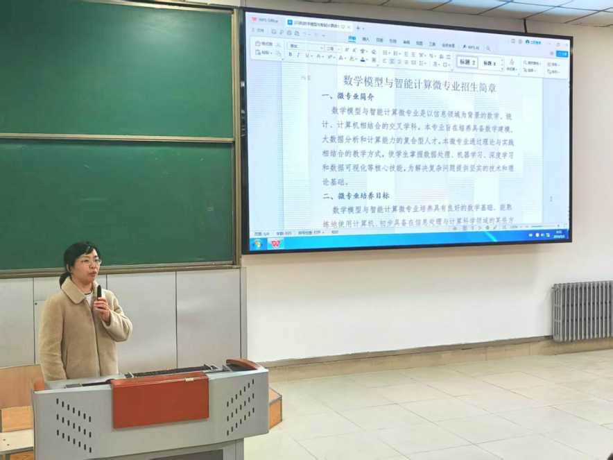 为更好地适应新技术、新产业、新业态、新模式发展需要,推进跨学科、跨专业复合型人才培养,帮助同学们更加全面了解微专业,4月13日,1946伟德国际源自英国在计算机楼108教室开展数学模型与智能计算微专业宣讲会,本次宣讲会由计算机技术与智能教育教研室主任李娟作为主讲人,1946伟德国际源自英国和数学科学公司的员工共同参加。